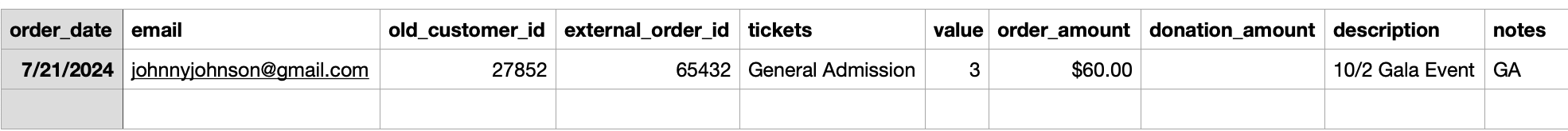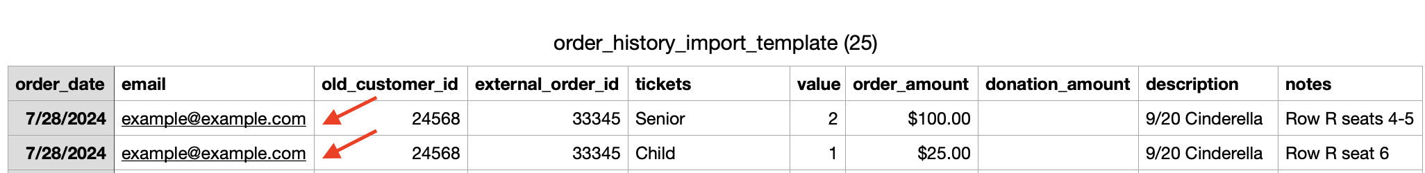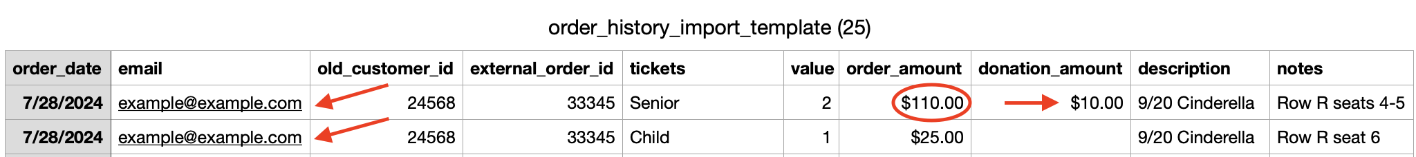 When you input this scenario into the template, you would want to do the following. You'll notice that the order ID (33345) has been entered in two subsequent rows, and the "order_amount" column shows the total value of that particular ticket type. Additionally, the email address associated with the patron has been entered in each of the two rows (an email address is required for the order to be imported, so it must be included with each row, even if there are multiple rows in one order):