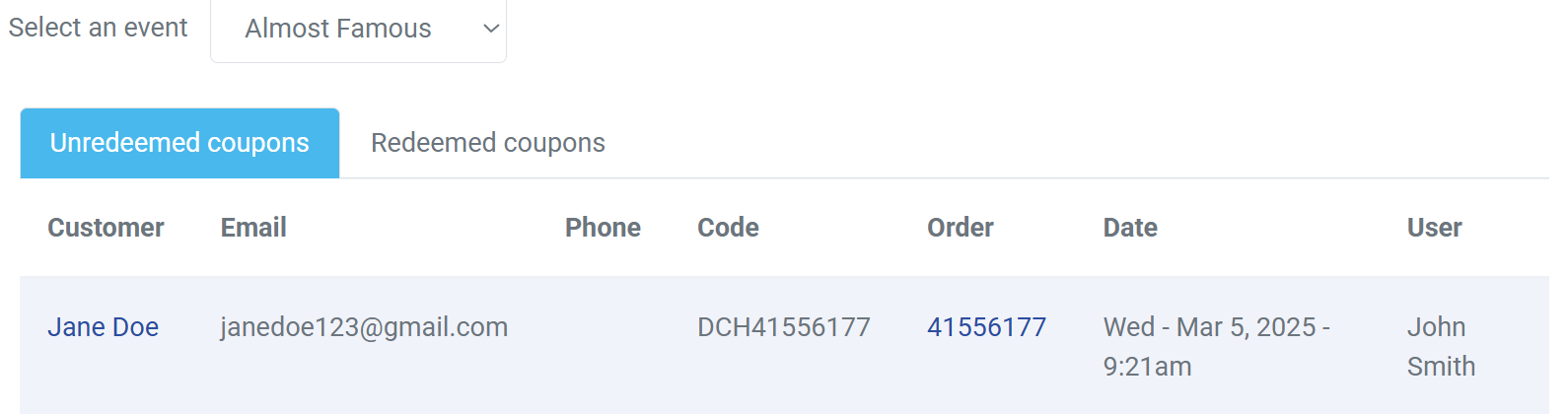 If you created a flex pass, you'd be able to see both redeemed and unredeemed coupon codes for that flex pass. This is also known as an auto-generated flex pass redemption report.