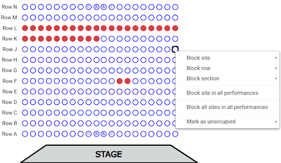 If you have seats that you are removing from your venue for a specific show, and you want the total seats available to reflect those removed seats, you can now mark them as "unoccupied" on your seating chart. When you mark seats as "Unoccupied" on any seating chart for a given performance, those seats will automatically be deducted from the total available capacity.