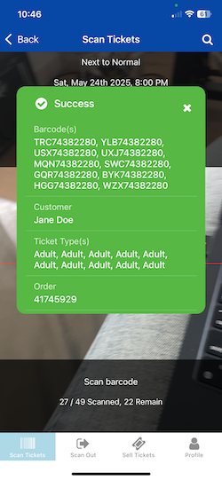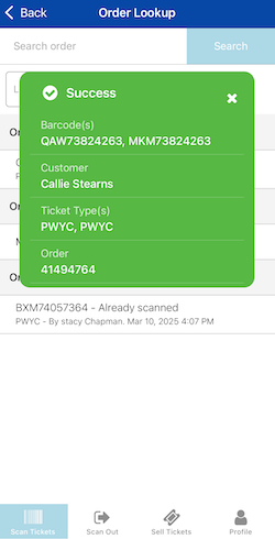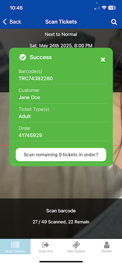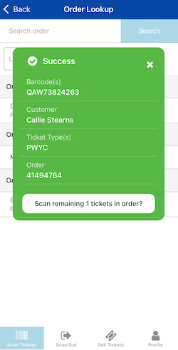 - When the "Success" screen for that barcode appears, you'll see a button to "Scan remaining tickets in order" as shown below