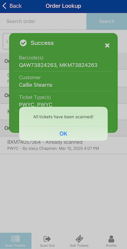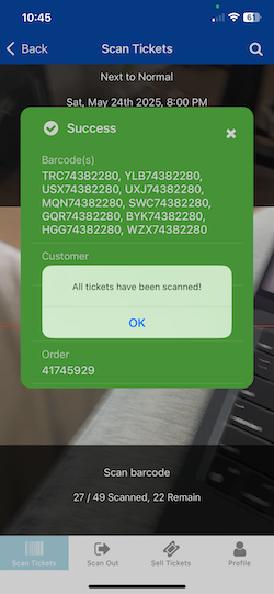 - Upon clicking the button, you'll see that "All tickets have been scanned" and the final screen will show all barcodes and ticket types for that order