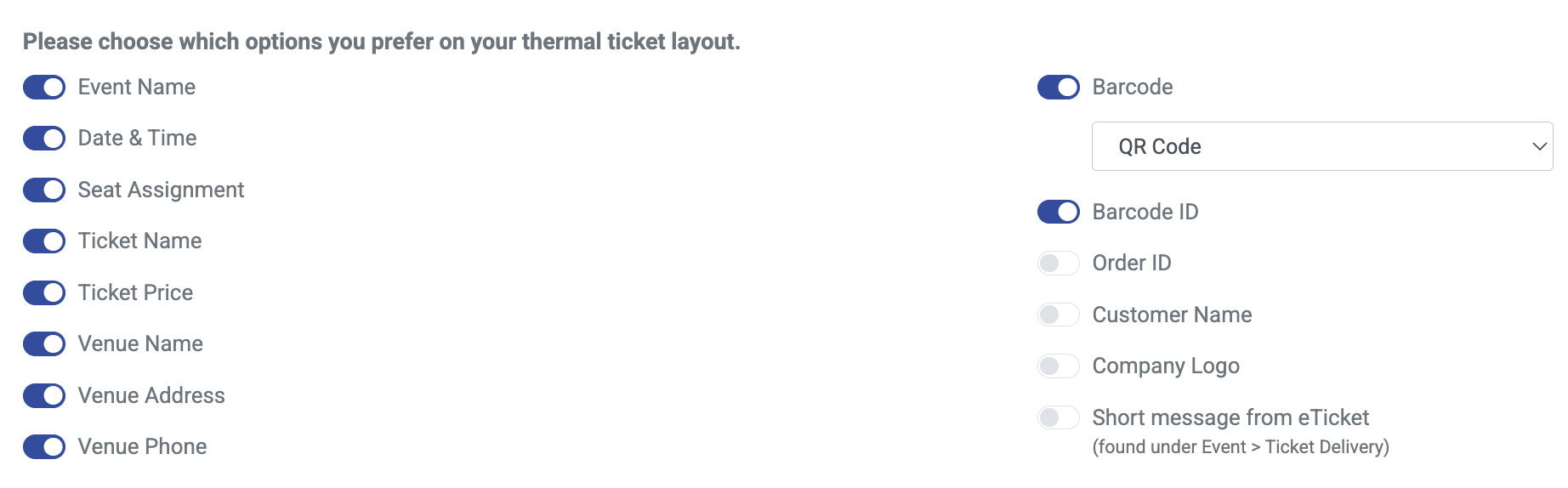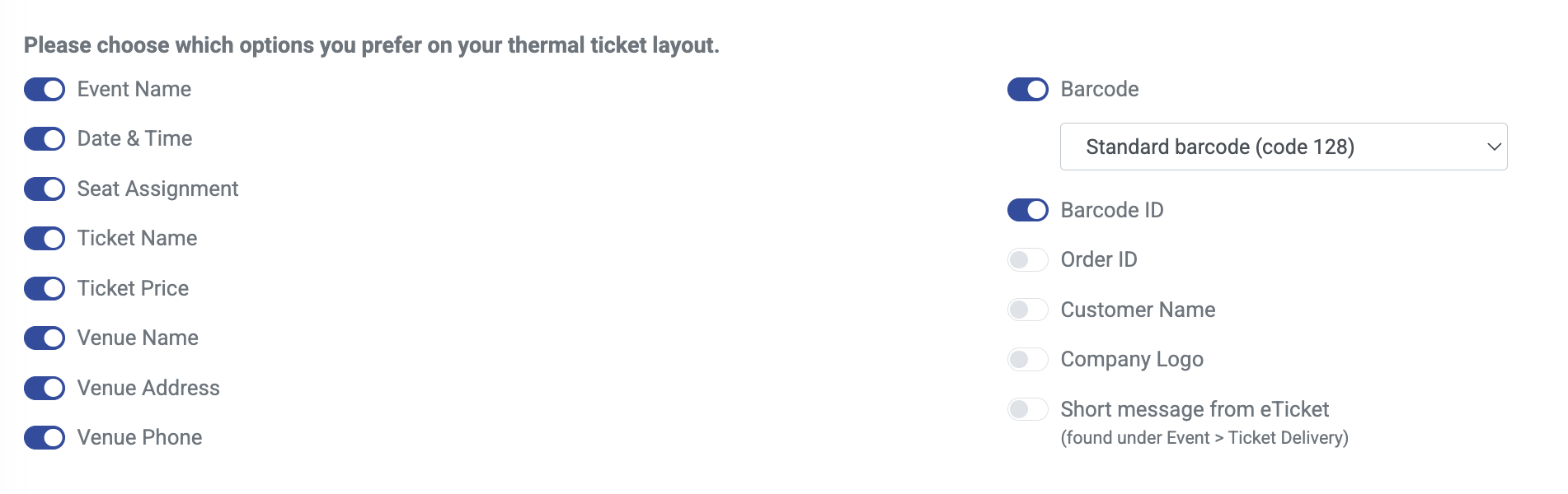 - In the section where you choose which options you want displayed on your ticket, make sure you have "Barcode" enabled.