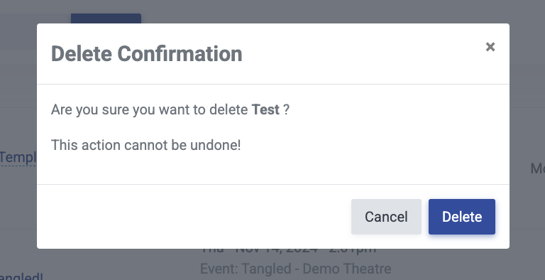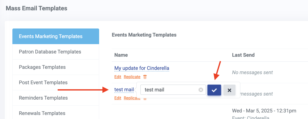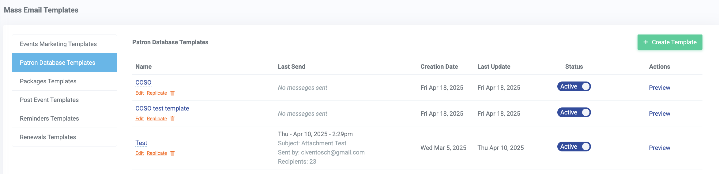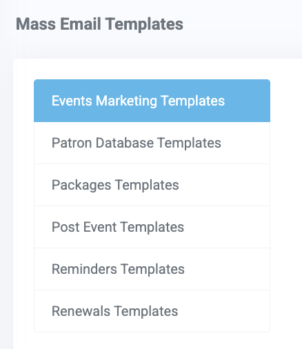 - From there, you'll see a mini menu of your various template types, including Events Marketing, Patron Database, Packages, Post Event, Reminders, and Renewals.