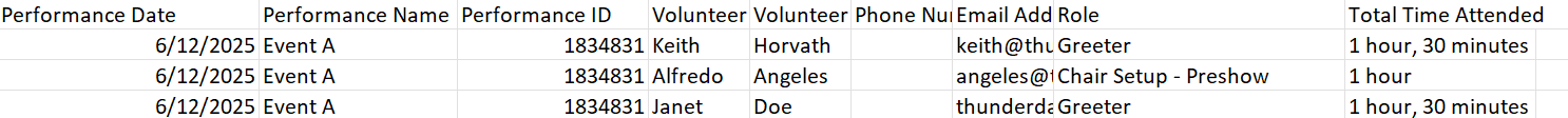 - Head to Reports > Downloads to see a CSV of all volunteers for that event. Below is an example of what the report will look like. Please note that at this time, these reports are only available for expired events.