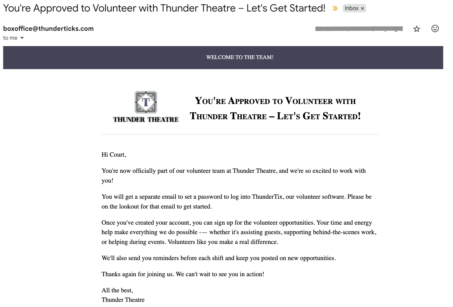 If you choose to "Accept" the volunteer, they will then receive a second email from ThunderTix, indicating that they have been accepted as a volunteer for your organization. It will look similar to the following:
