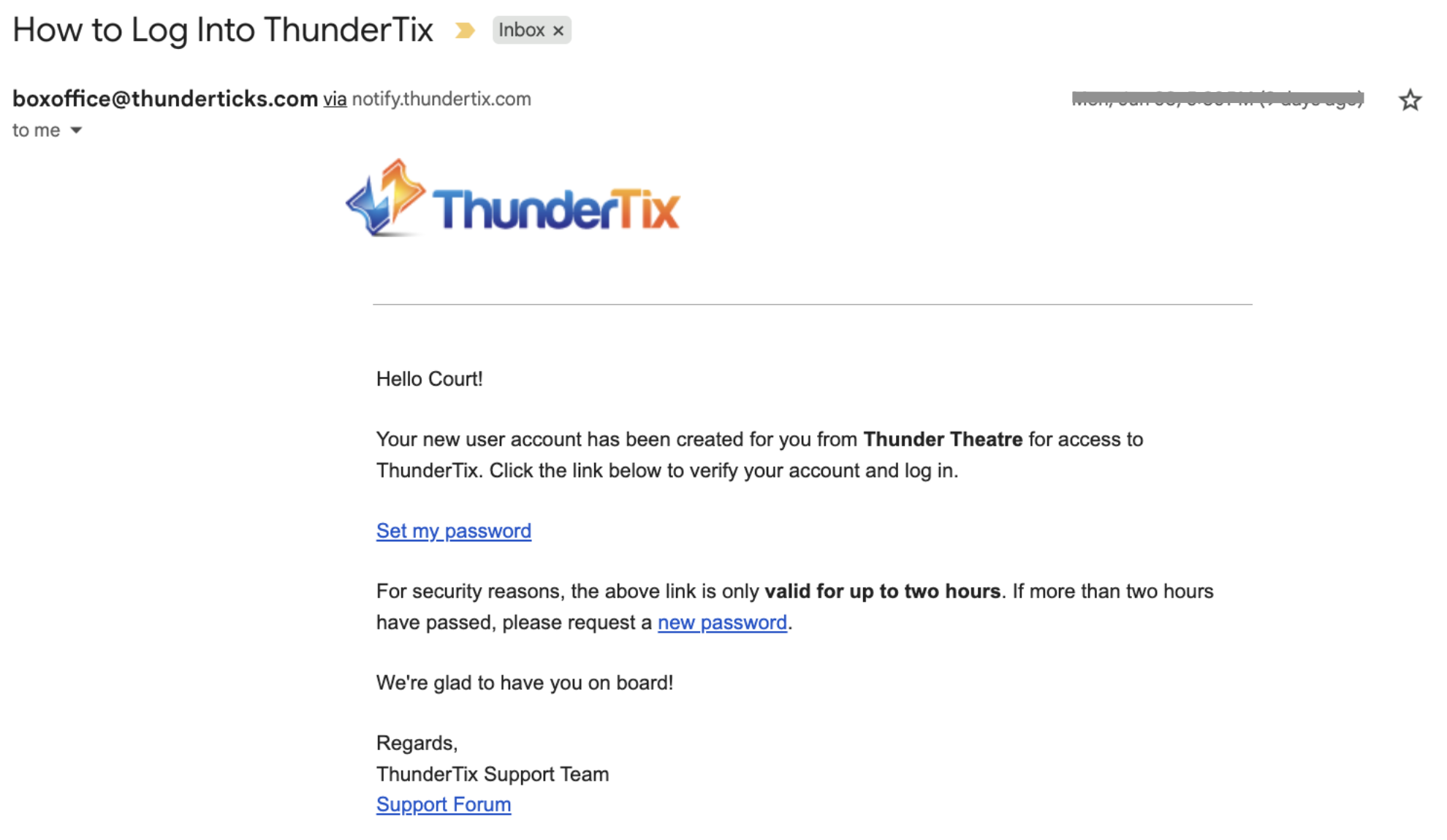 Finally, the volunteer will receive an email from ThunderTix, with login instructions, at which point they can set a password and login, and then begin signing up for volunteer opportunities. That email will be something like the following: