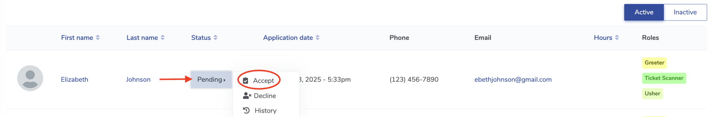 Next, you, as the venue admin, can choose to accept the volunteer. To do so, you'll navigate to Volunteer manager >> Volunteers >> locate the volunteer in question >> Click on "Pending" in the Status column and choose either "Accept" or "Decline":