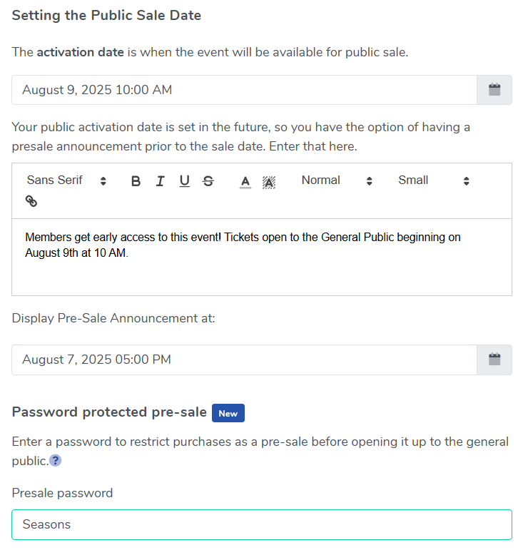 A presale to a targeted audience can be handled by selling tickets before the event officially "activates" for the general public. This option requires that a password be entered in order to access the event. A single password is used for the entire pre-sale. In order to do a presale, you'll need to: