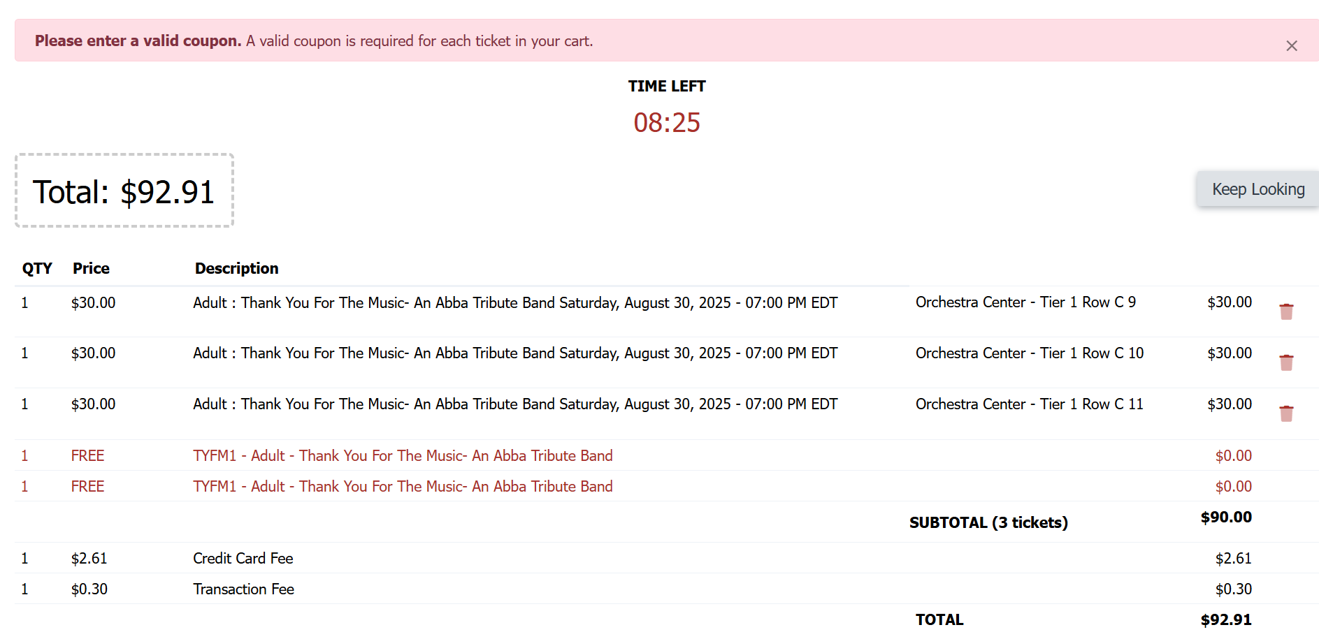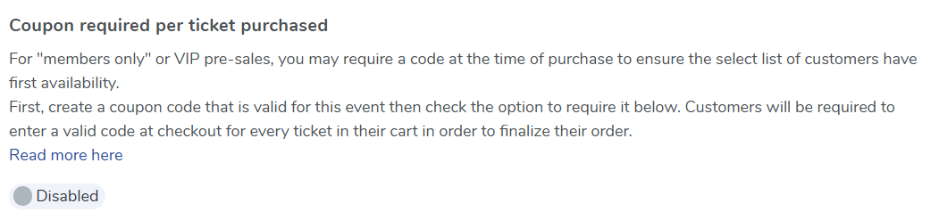 - Under Restrictions and Waitlist > COUPON REQUIRED PER TICKET PURCHASED.
