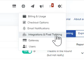 1. First, you need to authorize your X account in ThunderTix. Go to "Account Settings" in the top right corner of your screen, and click "Integrations and Pixel Tracking".