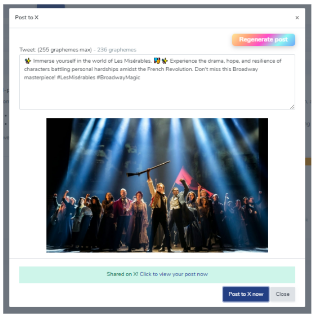 5. Here, you can click on “Post on X”. When you click on the box, you will see this box pop up- that has your event description and photo. image.png204 KB 6. Click "Regenerate" if you want our AI tool to come up with a different description! You can also edit in the box if you want to remove or add anything- as long as it stays under 245 characters for the X post. 7. Once completed, simply click “Post to X now”. You will see a green bar appear, that says “Shared on X” with a link that says “Click to View Post now”. image.png256.63 KB