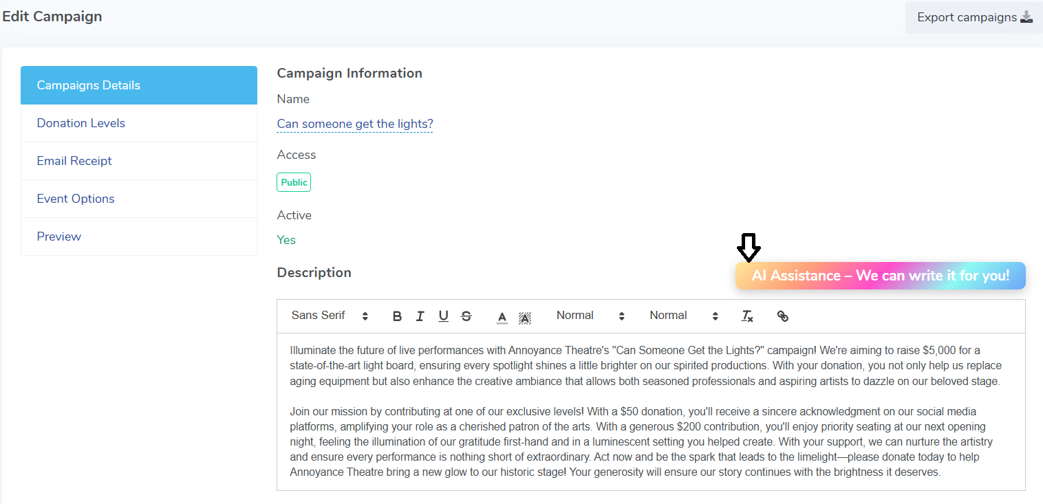 Absolutely! With AI Assistance, we can help you write your campaign description. This works for existing campaigns and new campaigns.
