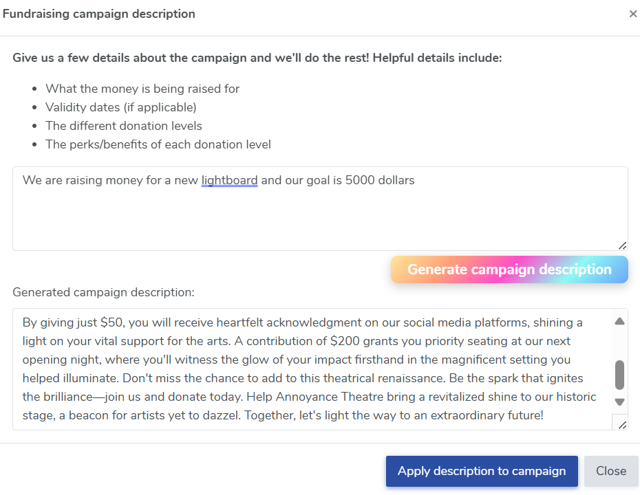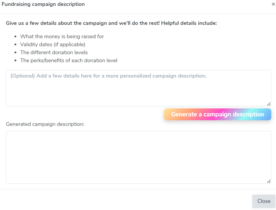 From there, click on the Generate a Campaign Description button and we will generate a description of your fundraising campaign.