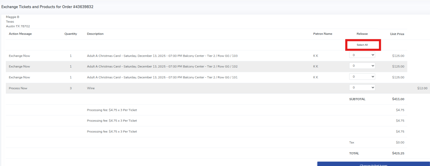 3. This will bring you into a page where you can select which tickets and products you would like to exchange to a new order. You have the option to "Select All", which will automatically select every ticket and product in the order if you are wanting to exchange everything. Keep in mind that you can't exchange ticket fees, but you can waive them in the next order if desired.