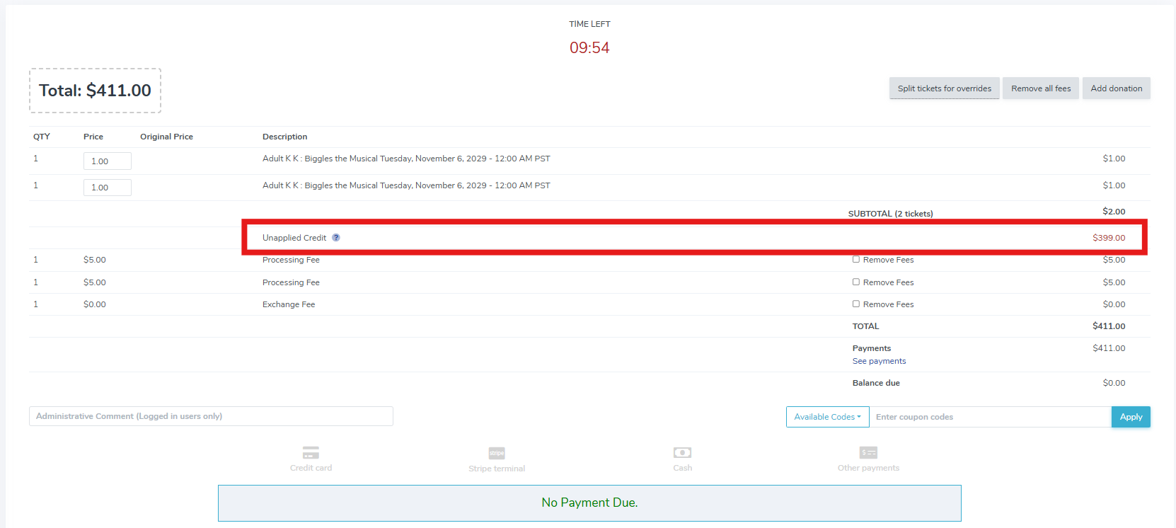5. If the new order is less than the value of the exchanged order, you will end up with an unapplied credit on the order which represents the "extra" funds that were pulled over for the exchange, and you will have no balance due.