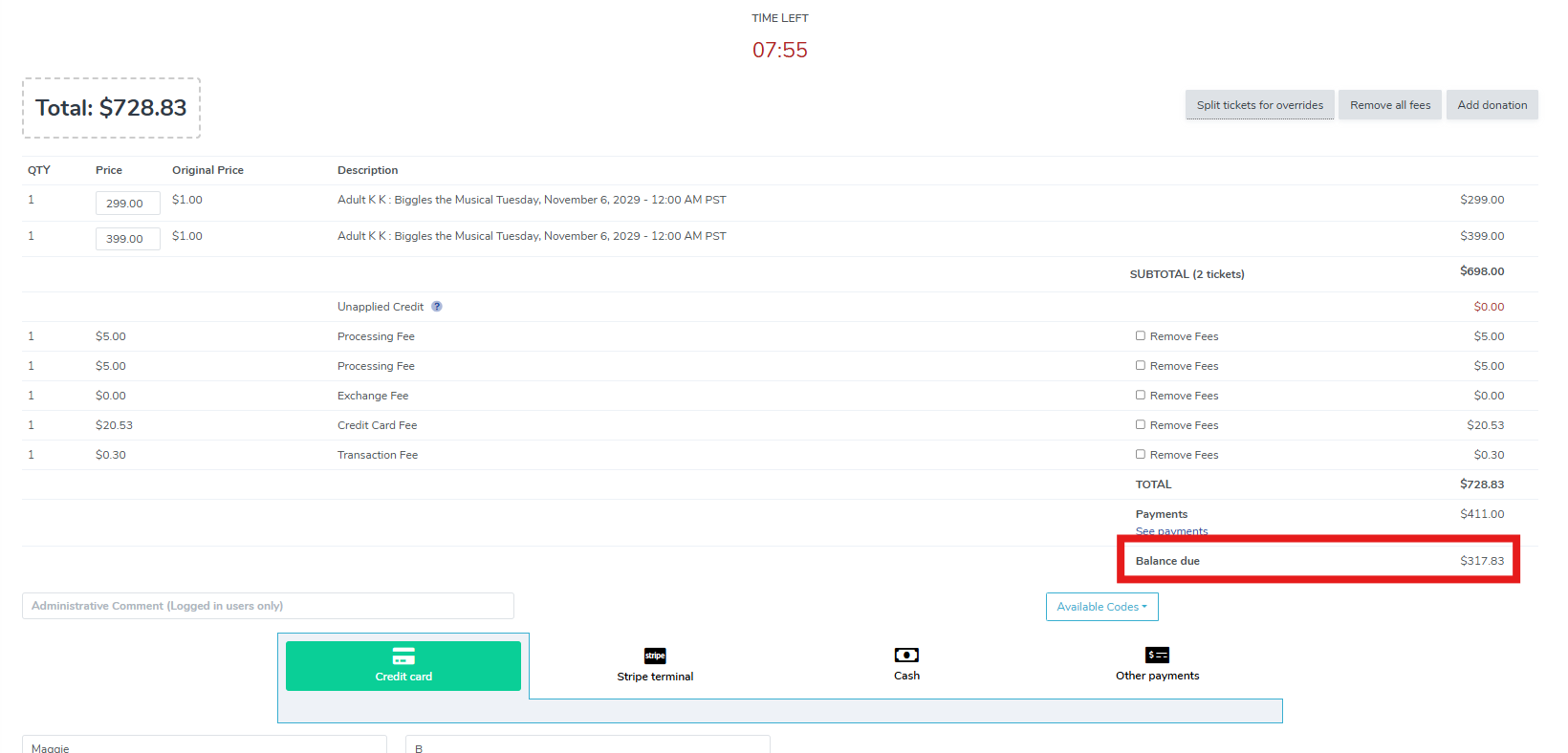 If the new order is the same value of the exchanged order, you will see there is no balance due because it is an even exchange. Your customer will receive an email with the new tickets.