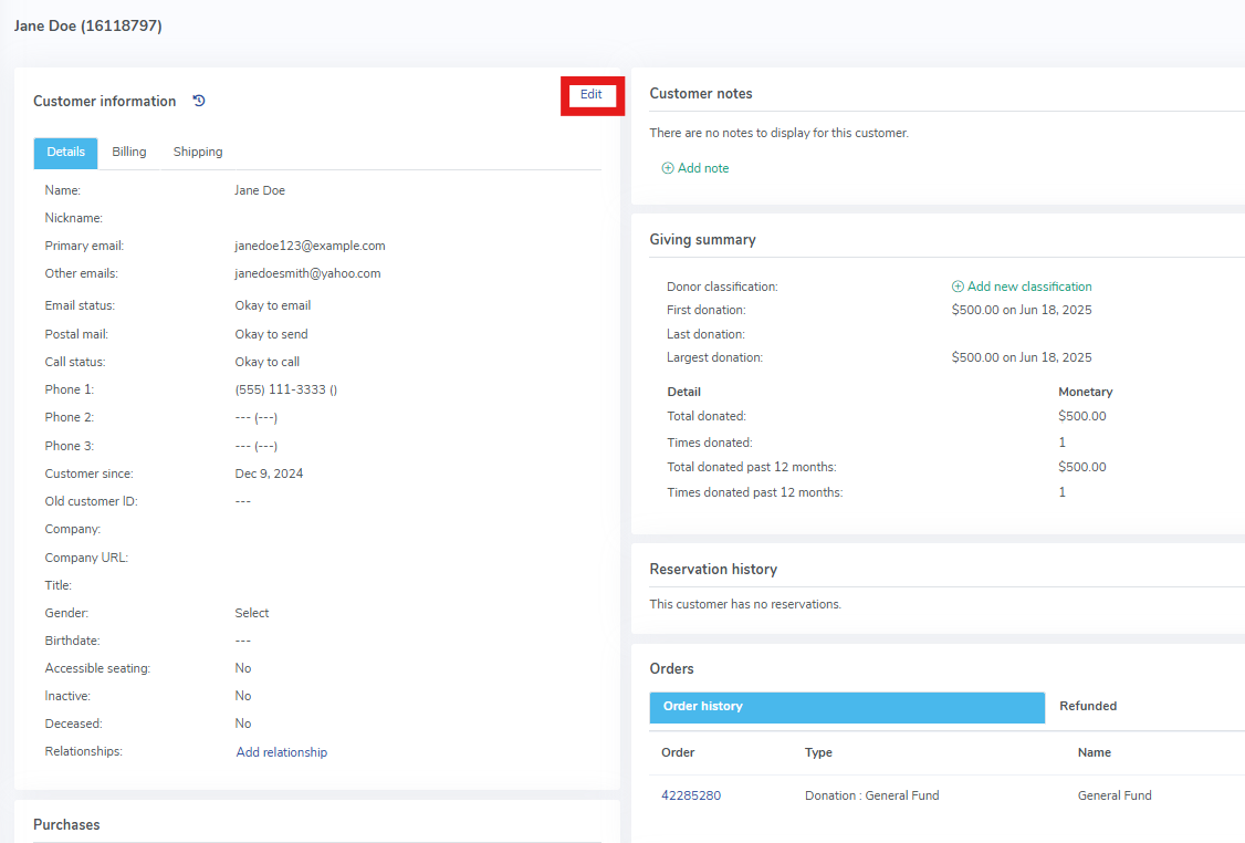 4. Once you are in your patron's profile, click "Edit" in the top right corner of the customer information box:
