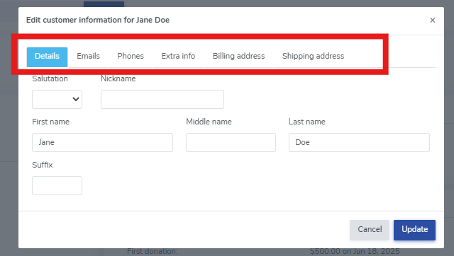 5. A box will pop up that will give you the option to edit the patron's name, email, phone number, company, title, gender, birthday, billing address and shipping address. You can also mark the user as someone who needs accessible seating, someone who is inactive, or deceased. Lastly, you can add additional emails or phone numbers if your patron has more than one.