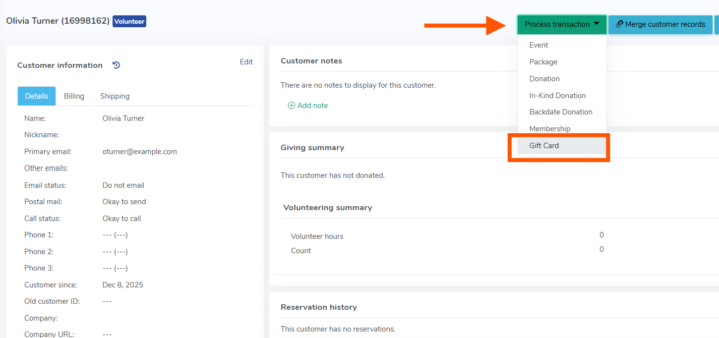 What’s changed?When viewing a customer’s profile, you’ll now see Gift Certificates available as an option under the Process Transaction dropdown—alongside Events, Packages, and Donations.This allows you to issue a Gift Certificate without navigating away or manually re-entering customer details.