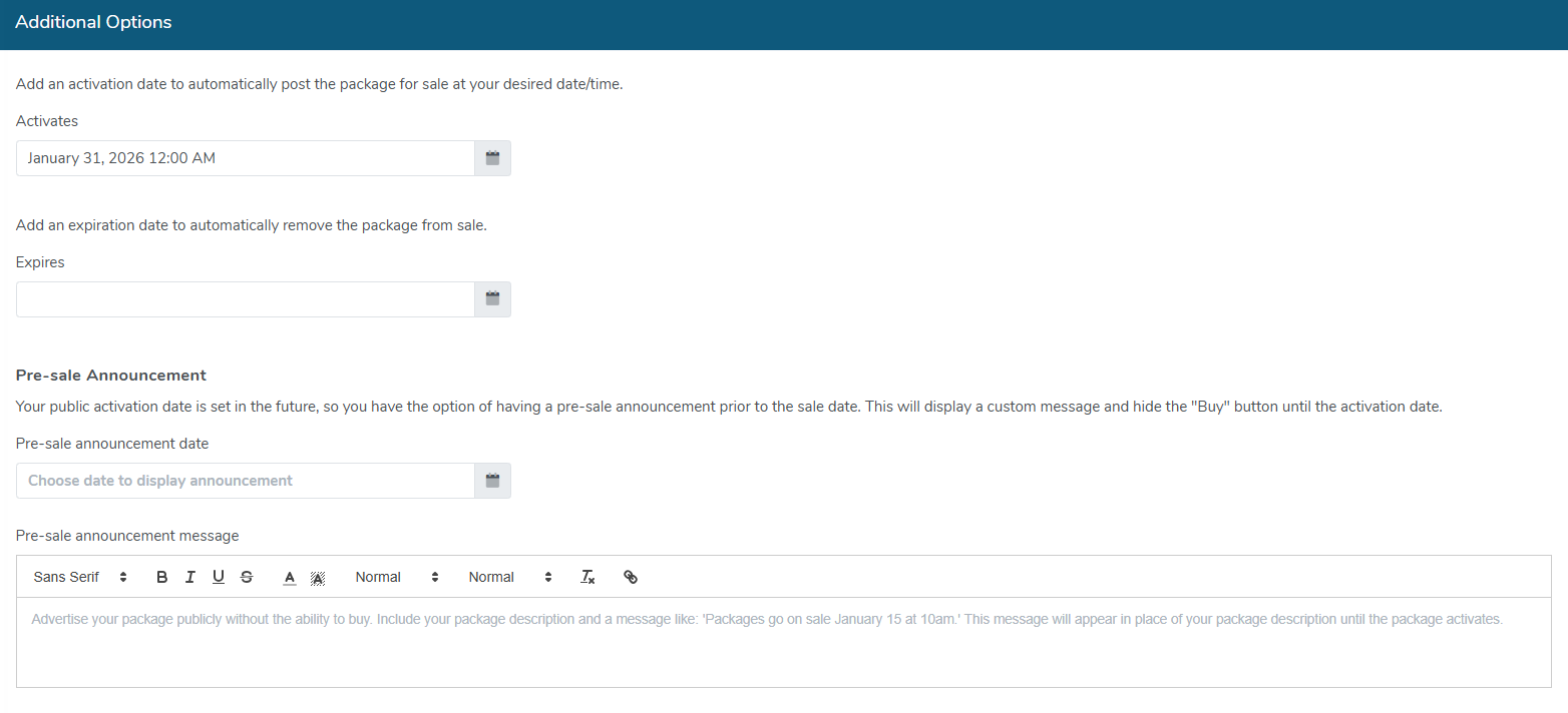 - When you get to the Additional Options tab, set your activation date for the date you want your package to go on sale