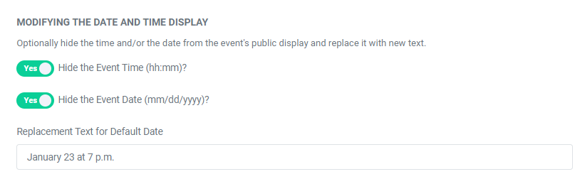 - In the field labeled "Replacement Text for Default Date", fill in the date and time that you would like to be displayed for this event/the actual time