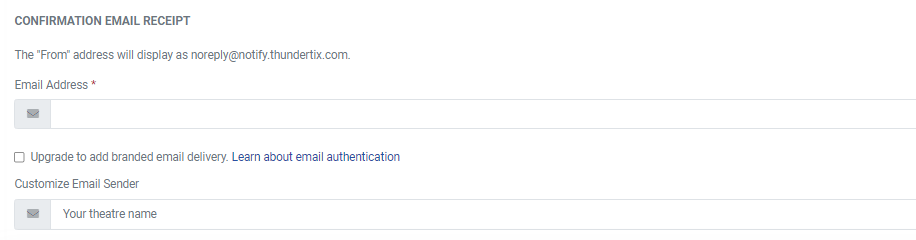 To change the sender address on the email confirmation receipt, just enter the email address you would like the confirmation emails to come from. Several organizations will use their box office email, but it is completely up to you on what you'd like to change the email address to.