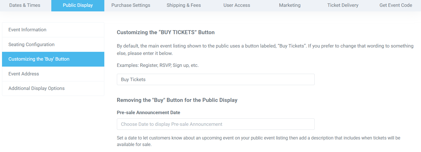 To add a post-sale announcement to an event, please follow the below steps:Head to your Event Manager > Select > Manage your event- Click the Public Display Tab >> Customizing the Buy Button