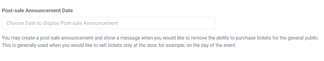 The post-sale announcement is used to inform customers that tickets are only available at the door the day of the event or to show the event description when the event is sold out (if it’s a single event). This can be used to inform customers of other events or prompt them to check back in case tickets become available in the future.