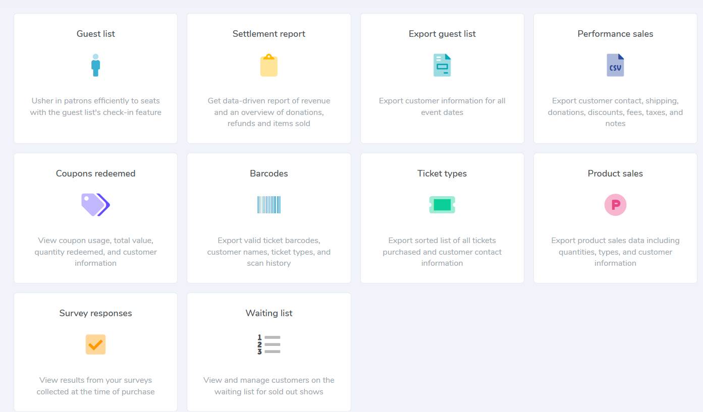2. Go to the Reports column on your desired performance and select the fourth icon. The icon says "CSV" and when you hover over it, it's labeled "Performance Sales (CSV).