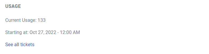 You can get a ticket count from the Billing and Usage tab within your Account Settings. The Usage displayed is a count of all tickets sold in your current billing cycle through yesterday at midnight Central time.